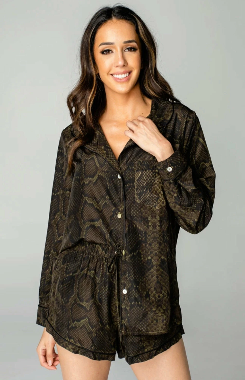 Our pajamas are new and IMPROVED! We are obsessed with this buttery soft fabric for cozy fall nights. Our Anna pajama set features buttons up the front, a drawstring waist, and a pocket on the chest. A perfect gift for anyone in your life, including yourself!