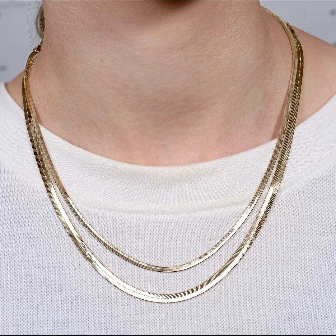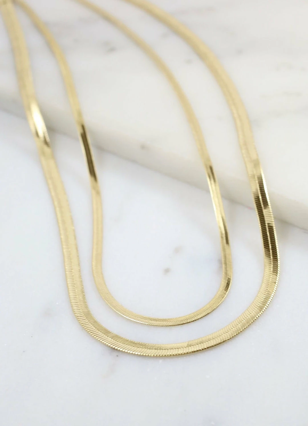 This simple double layered necklace features a top link chain and a flat snake chain.