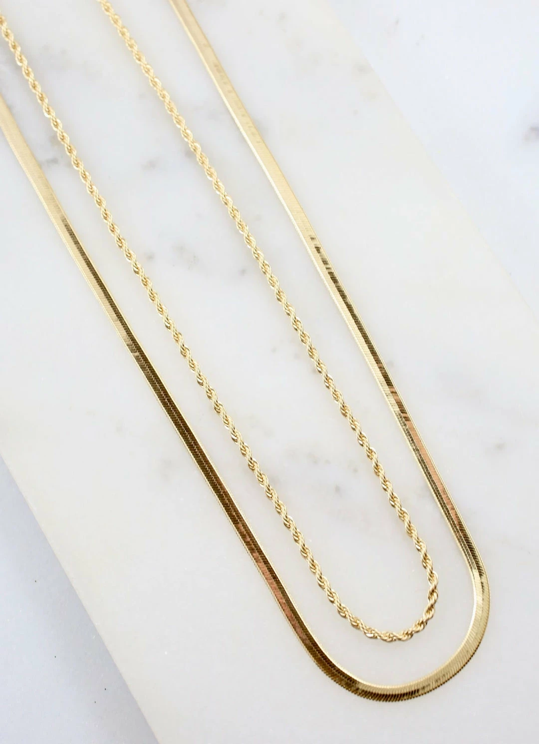 This double layered necklace is made of two different strands for an elegant look. There is as flat herringbone chain and a twisted link.