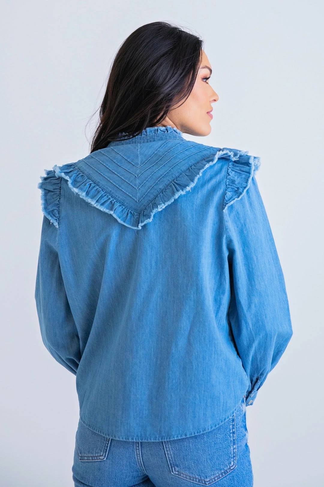 Denim on denim is back! Love the button down, ruffle detailing. Also would like great with black or white denim! Runs tts.