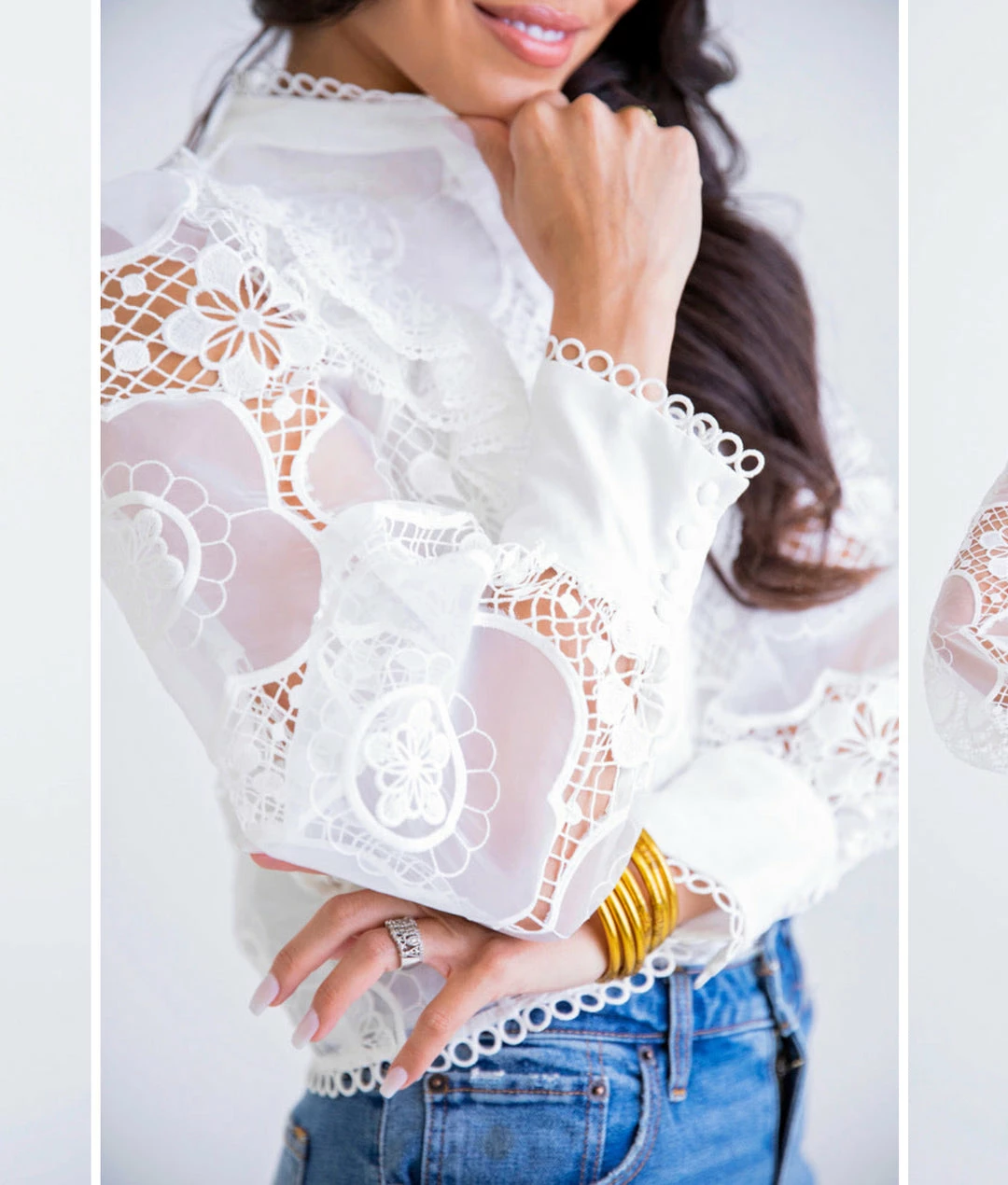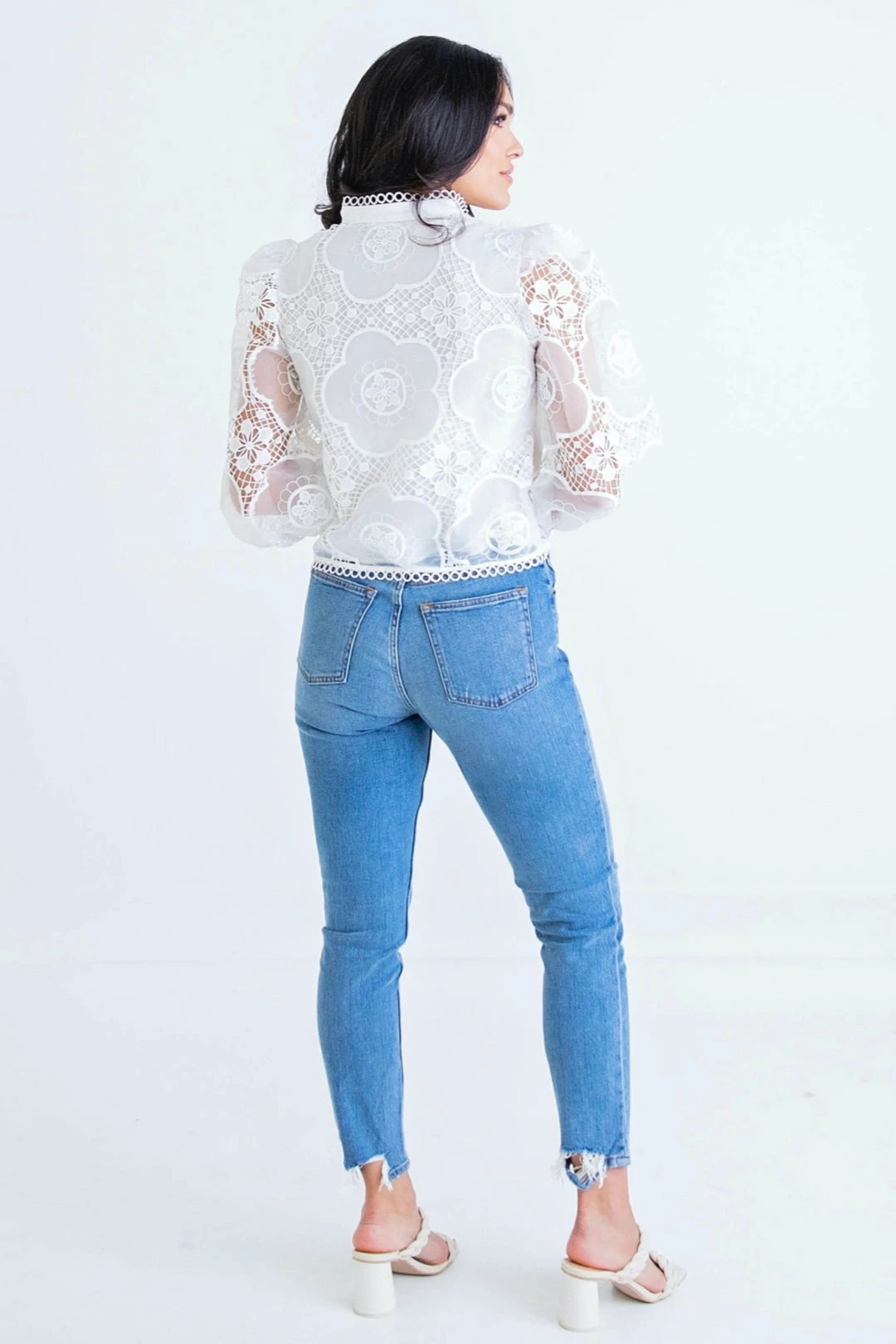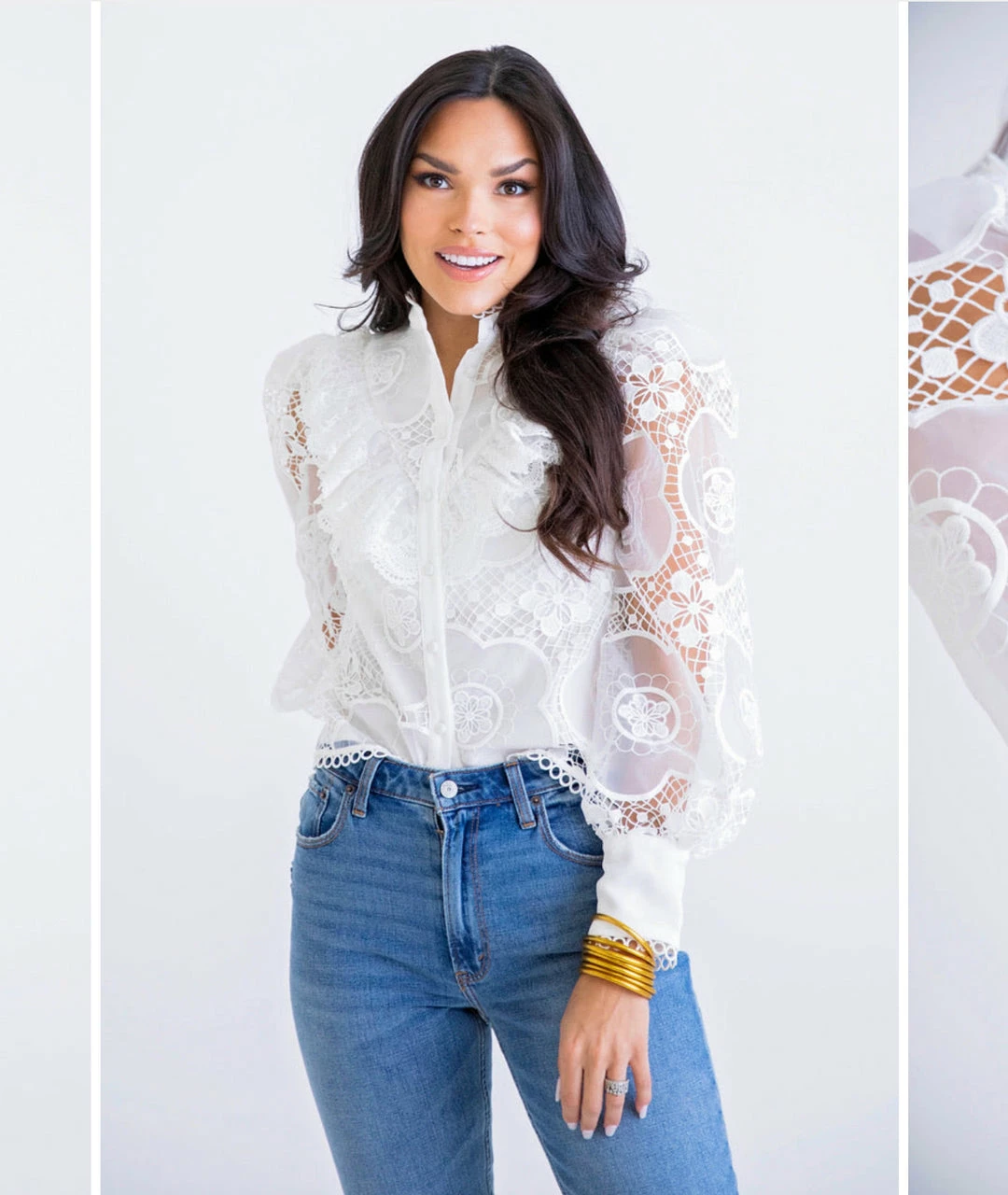 The Karlie Lace Ruffle Top is a beautiful lace long sleeve top that is perfect for dressing up or just wearing with your favorite pair of jeans.