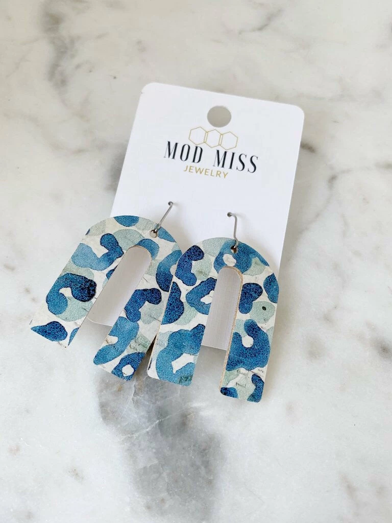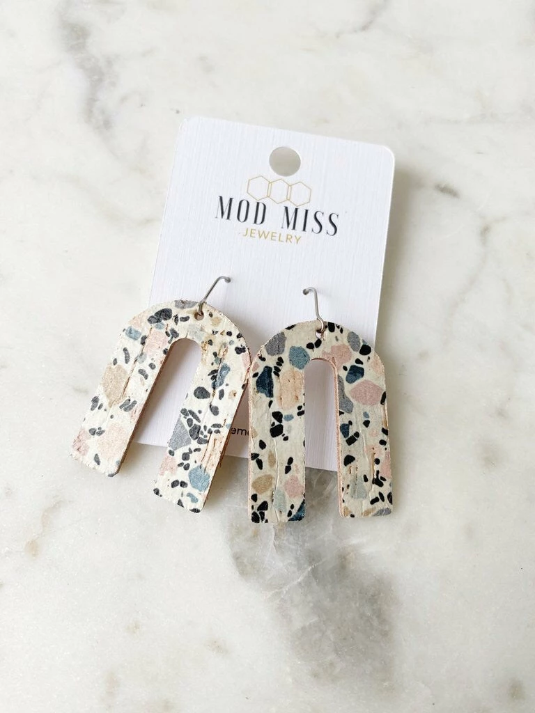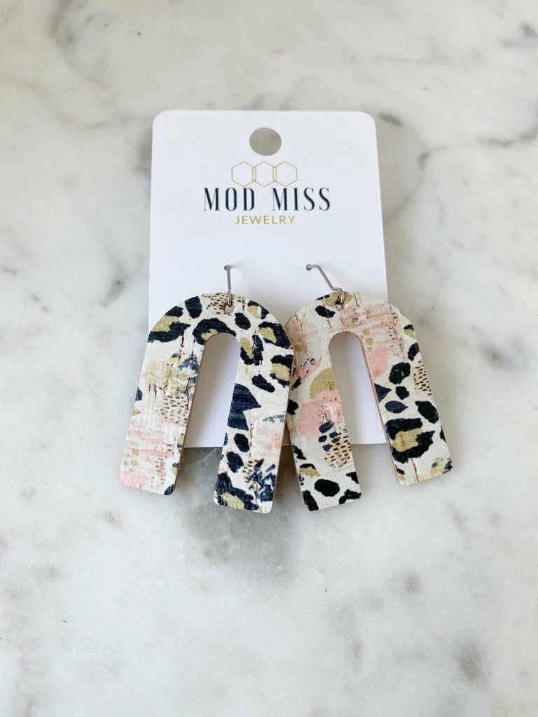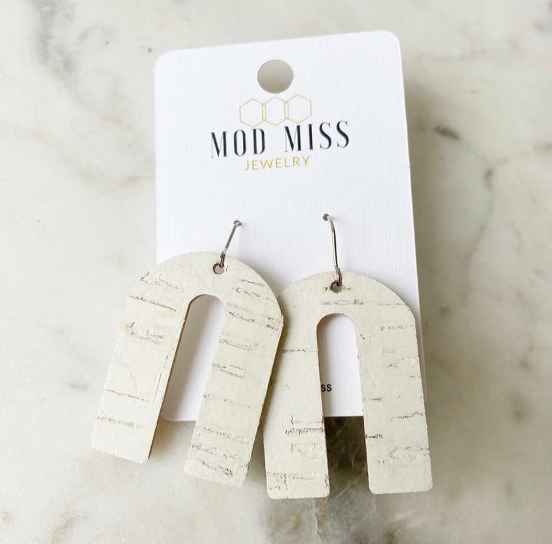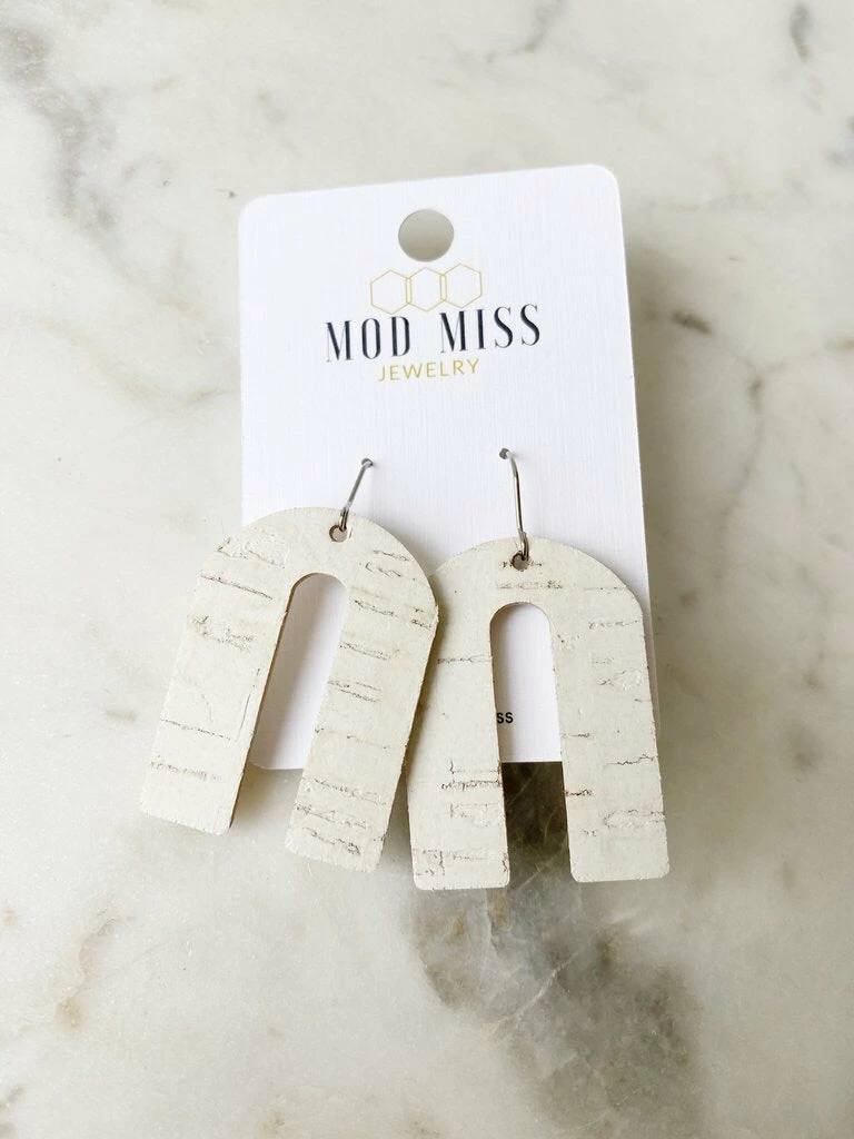 Trendy statement earrings with a fun modern look. These cork leather earrings have a bold arch shape.