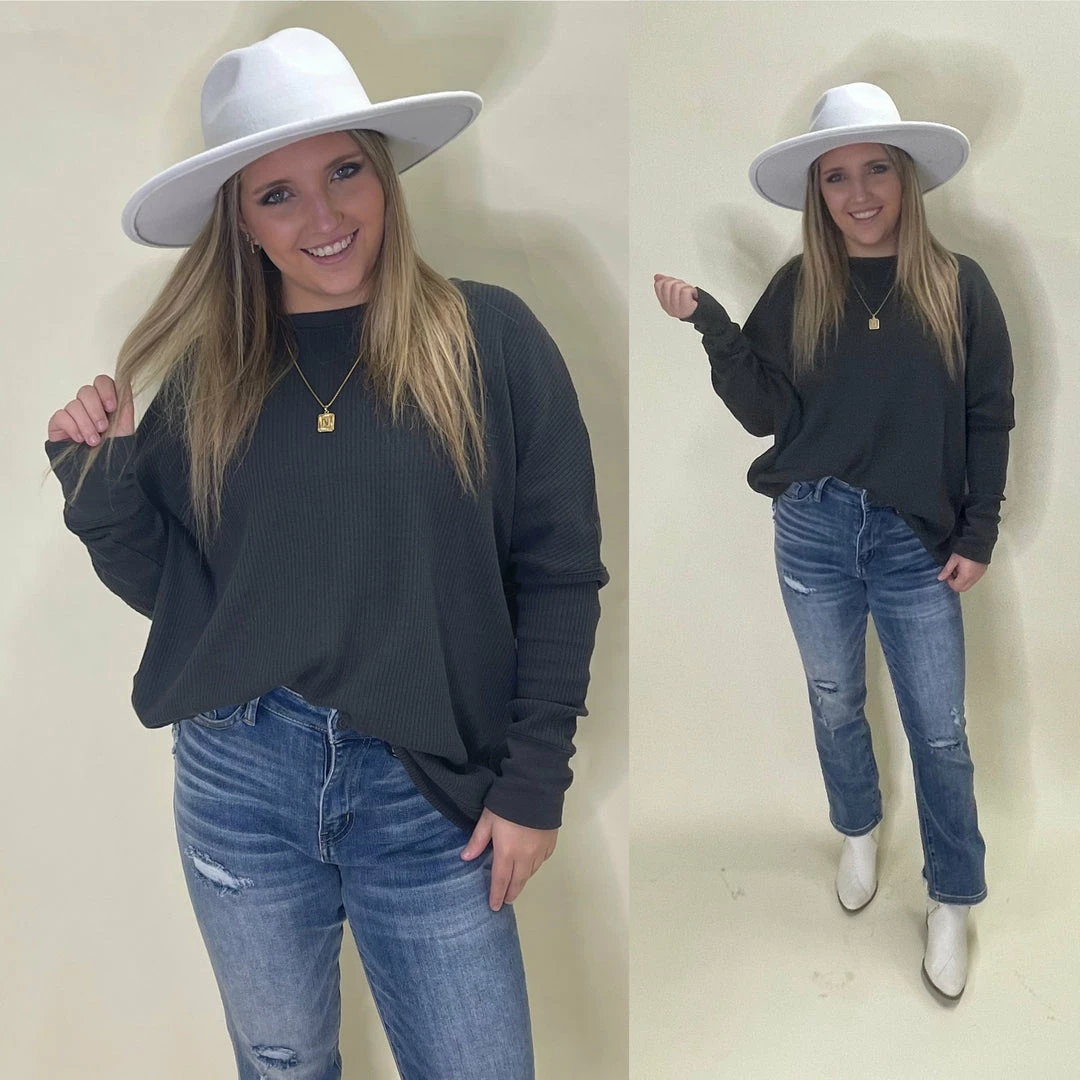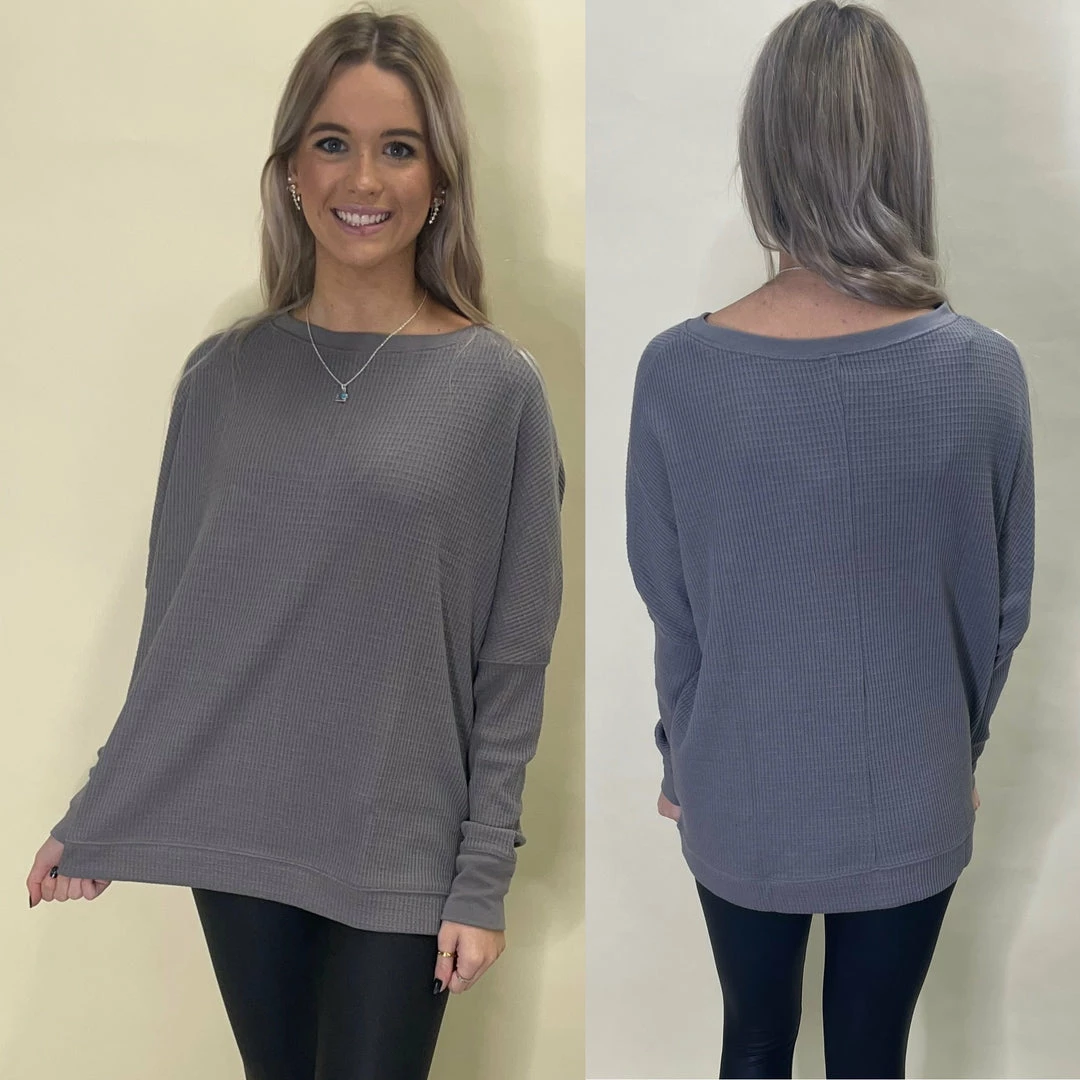 This super cozy top has a boat neckline, wide enough to be worn off the shoulder if you wanted too. It s a waffled kit material thats breathable and has a relaxed fit.