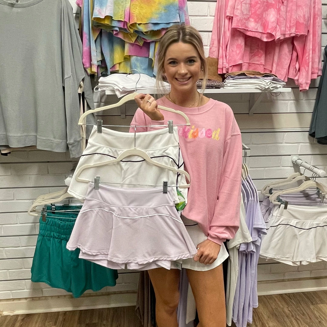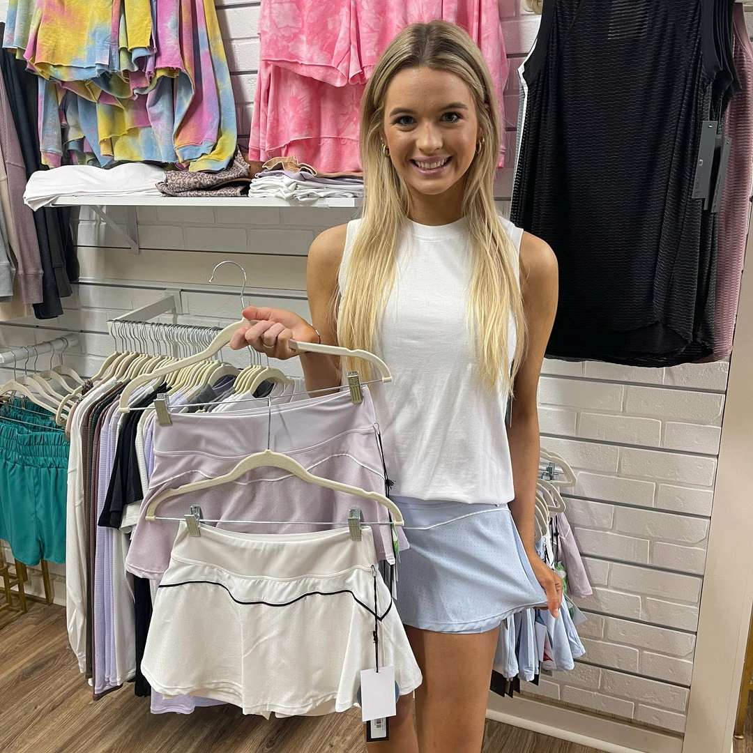 This skort features a zipper pouch in the back at the waistband, an all over perforation, and a built in solid black short underneath. Model is wearing a small. She has it paired with our Avery Slit Flowy Tank.