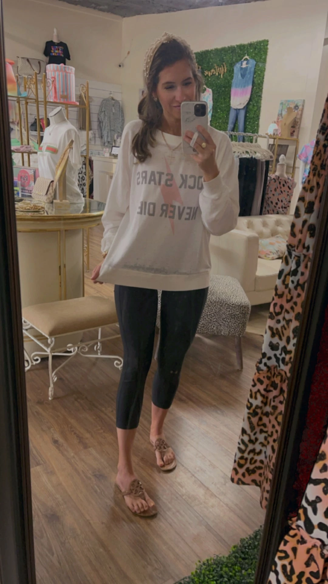 Live forever as a rock star! Not your regular graphic sweatshirt that includes a legendary in-house designed rock stars never die typography and bolt graphic. Its perfectly oversized fit thats on a soft-washed down fabric with ribbed cuffs and collar. Thin fleece like lined inside.