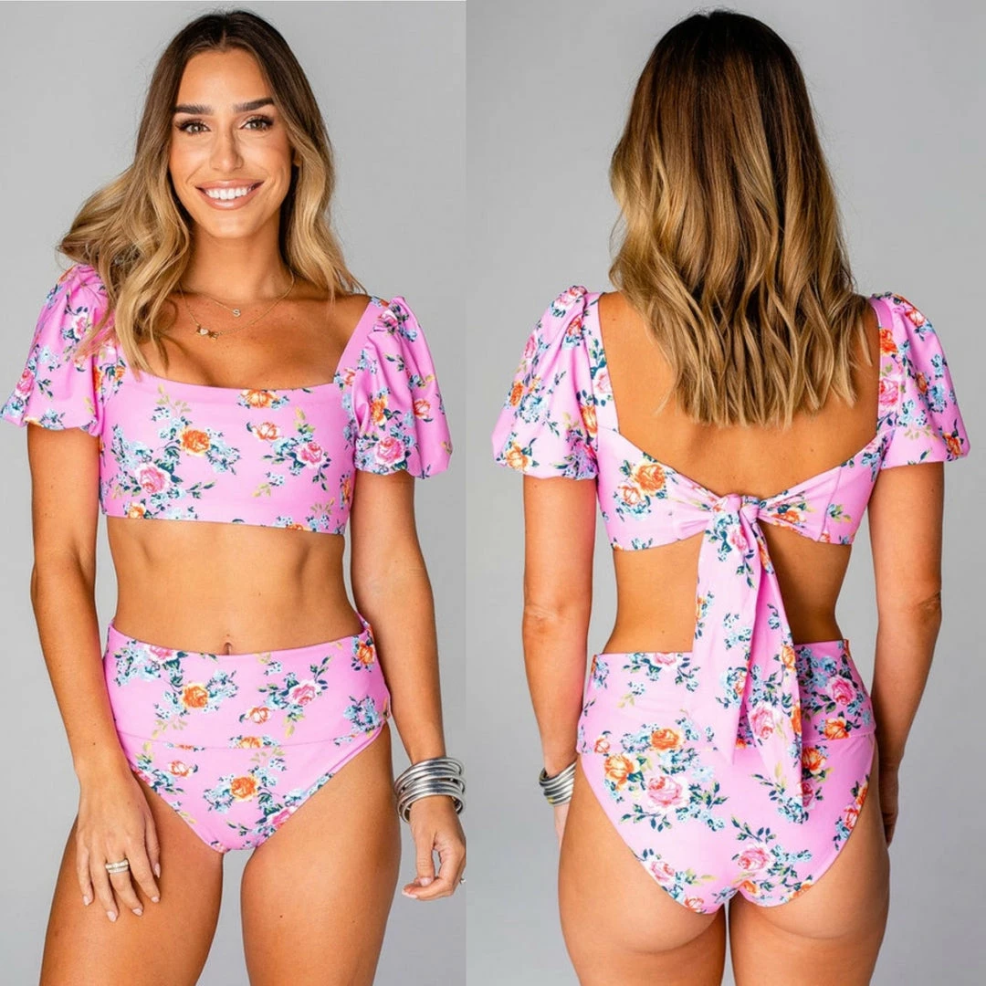 Just the swimsuit you’ve been looking for! The Jojo features bubble sleeves, bandeau top with a tie back, high waisted fit and cheeky bottoms.