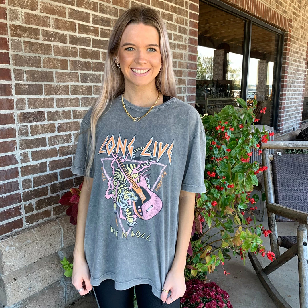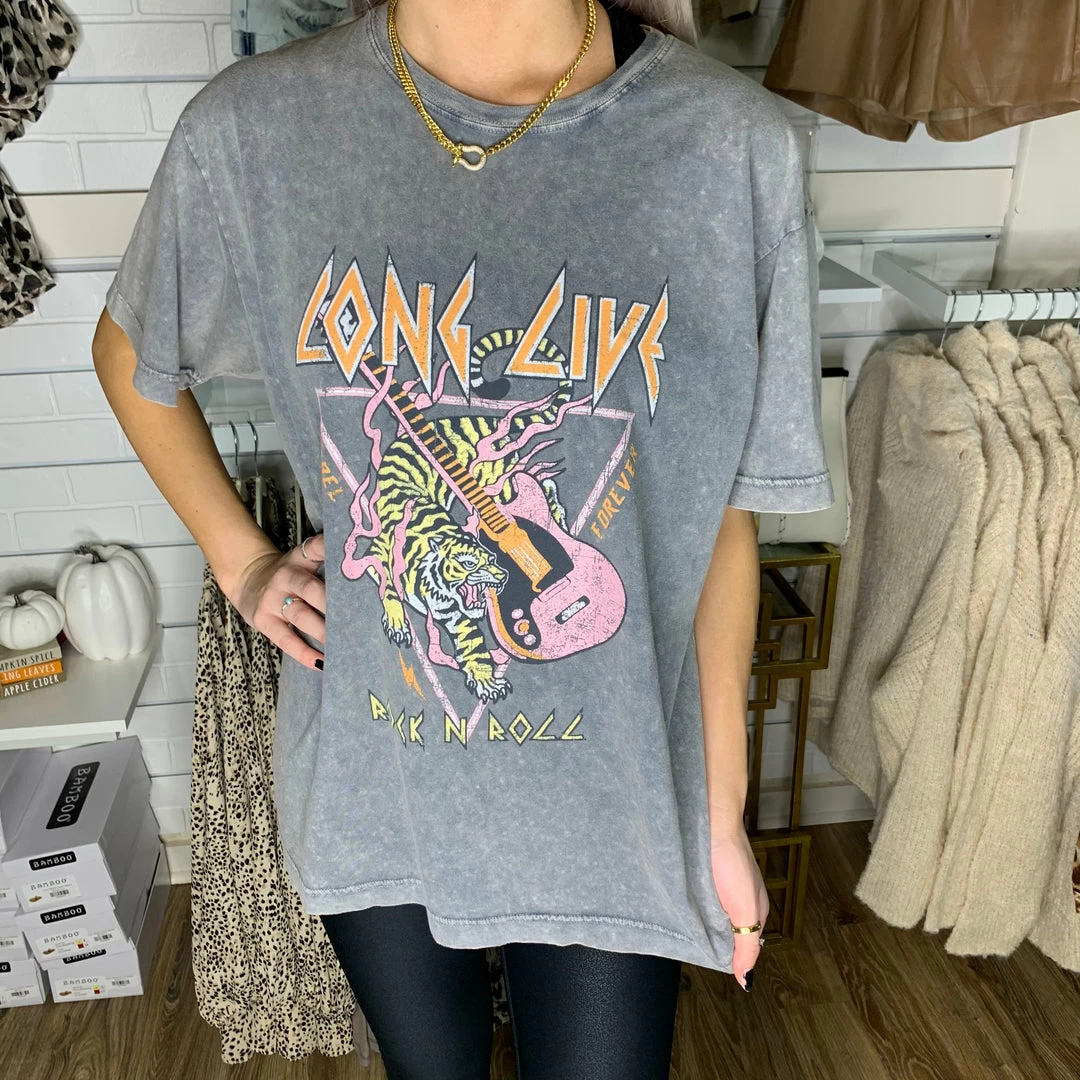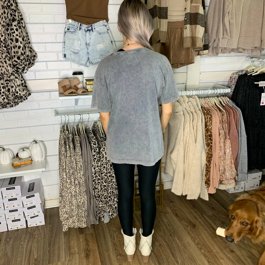 This graphic is a boyfriend fit, has rolled cuff sleeves, and 100% Mineral wash!